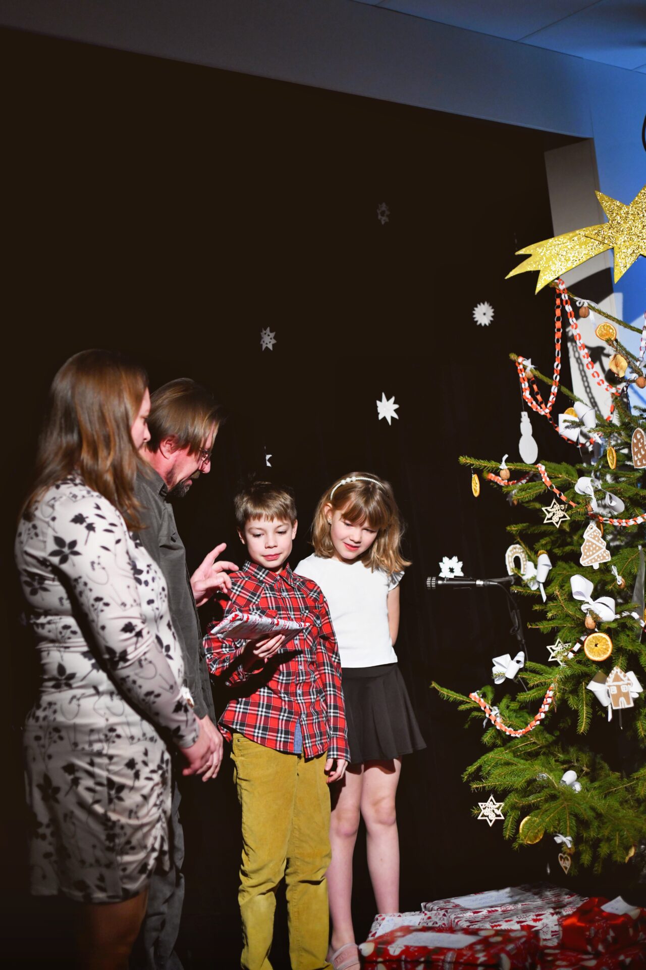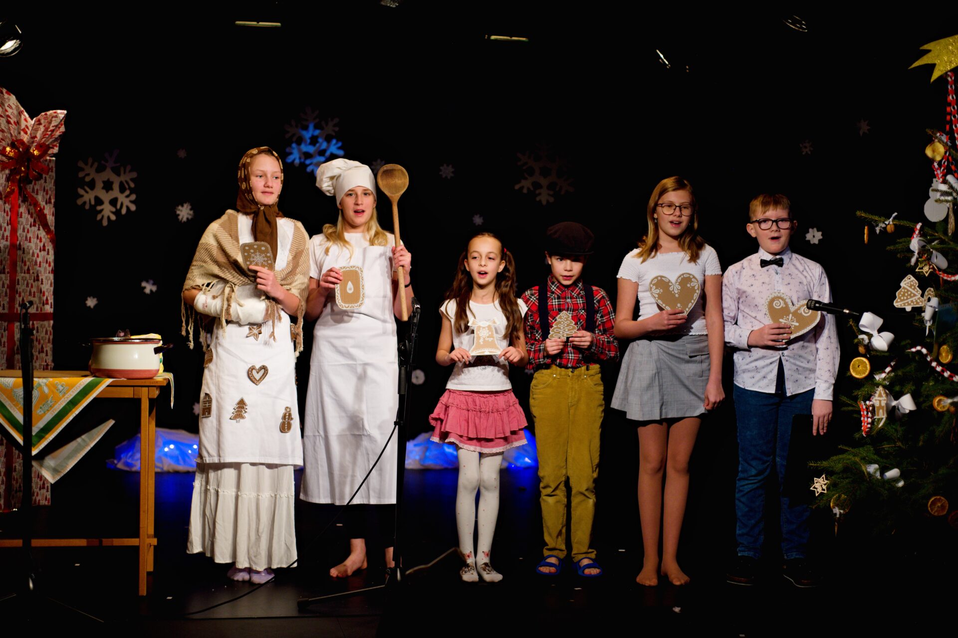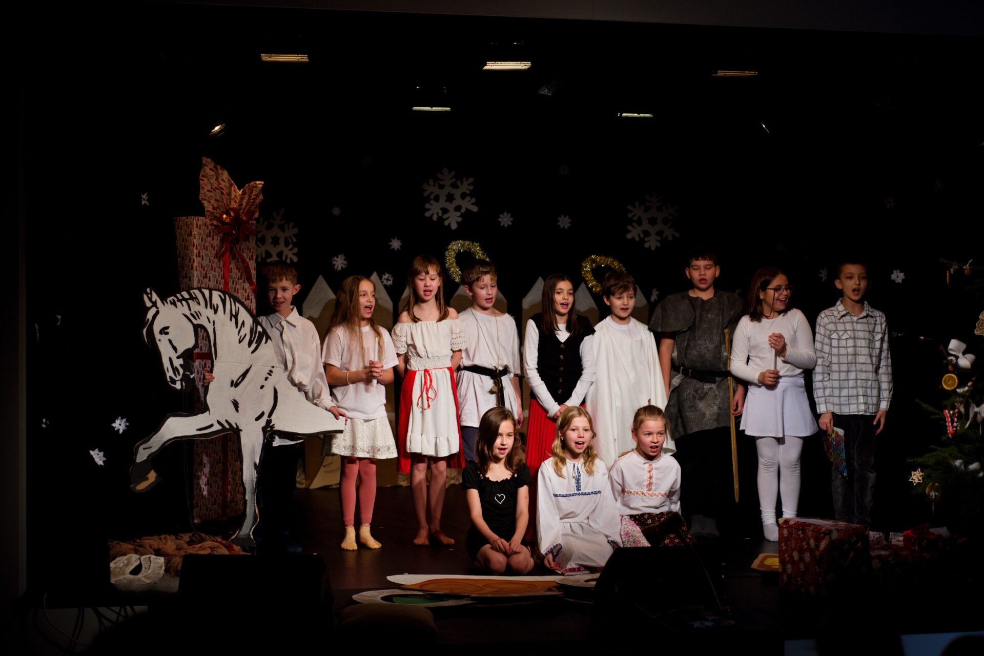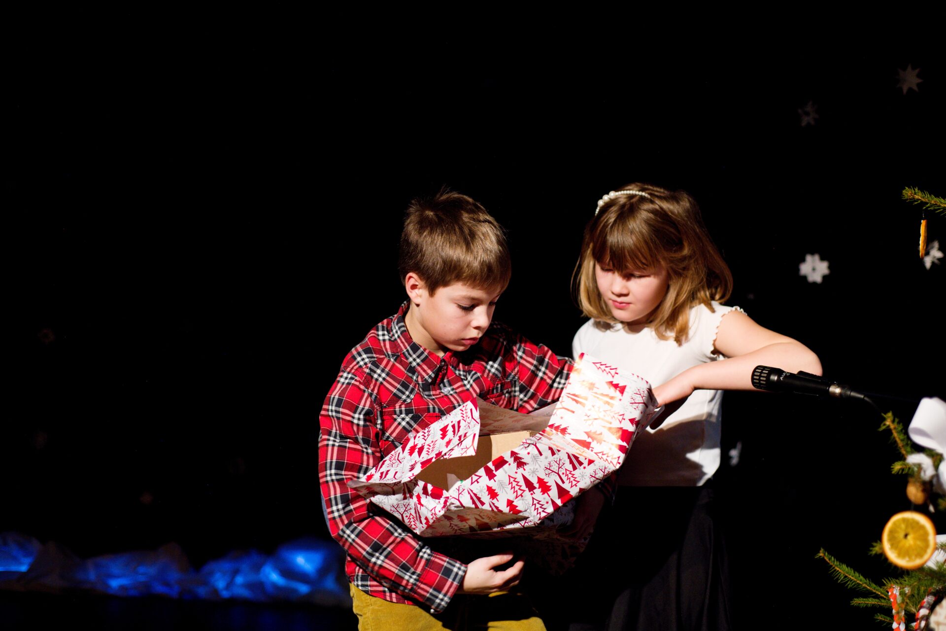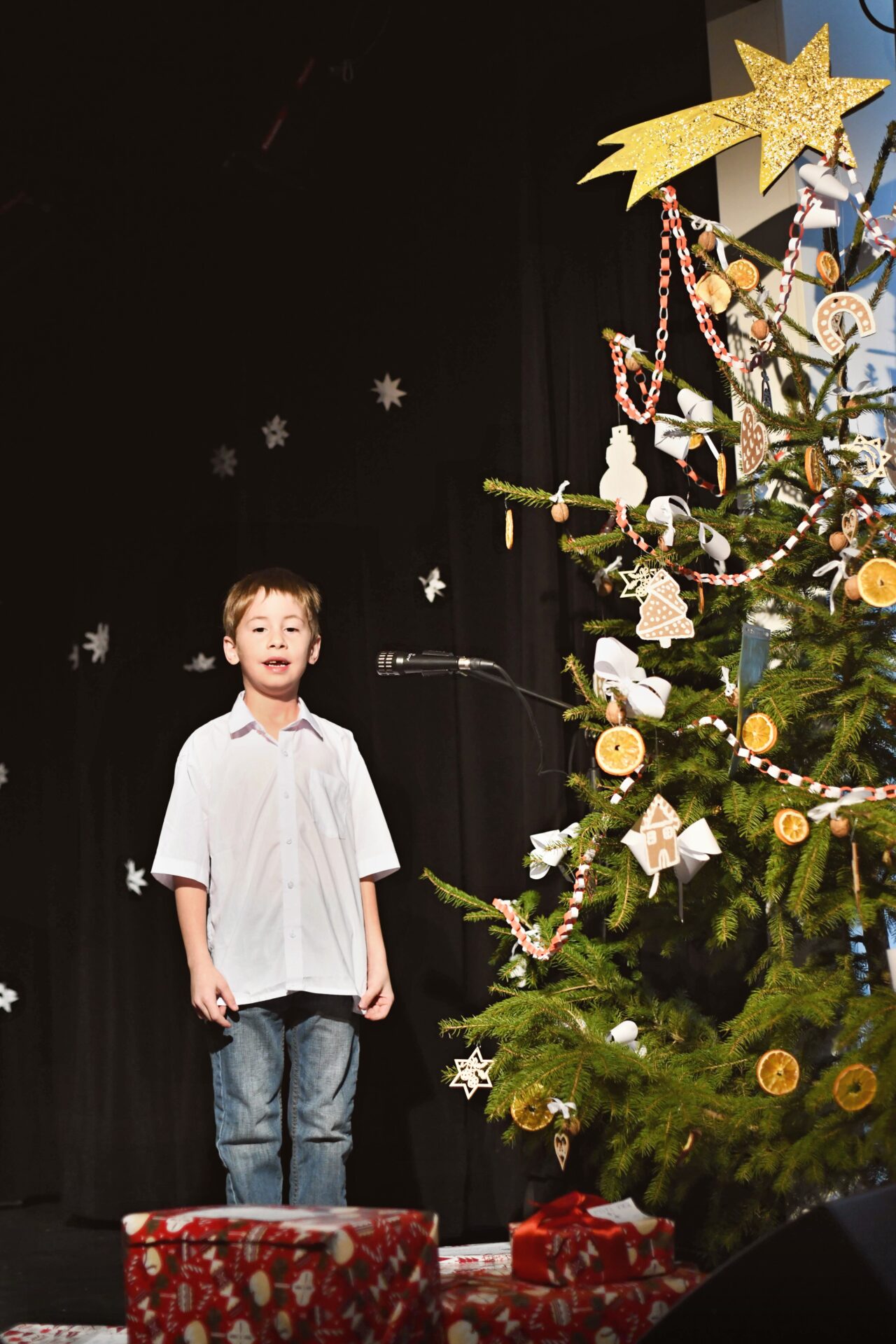Celé vystoupení symbolicky začalo u štědrovečerního stolu, kde zasedla rodina, a netrpělivé děti s radostným očekáváním vyhlížely příchod Ježíška. Ale až zazvonění zvonečku oznámilo tu nejkrásnější chvíli – čas rozbalování dárků. V každém z nich se ukrývalo něco výjimečného – kouzelná vystoupení, která pod vedením paních učitelek natrénovaly děti z 1. stupně, děvčata z 8. A a žáci 9. A.