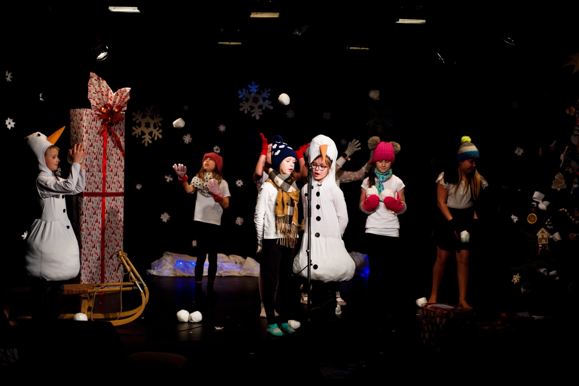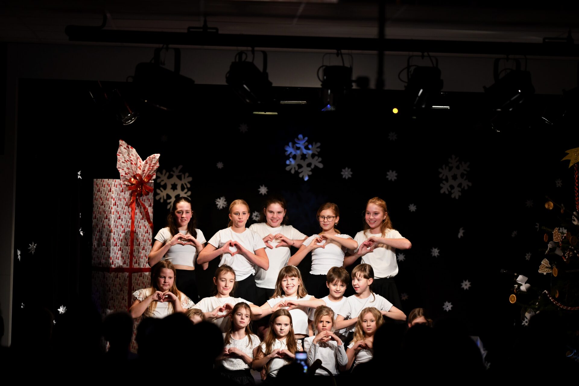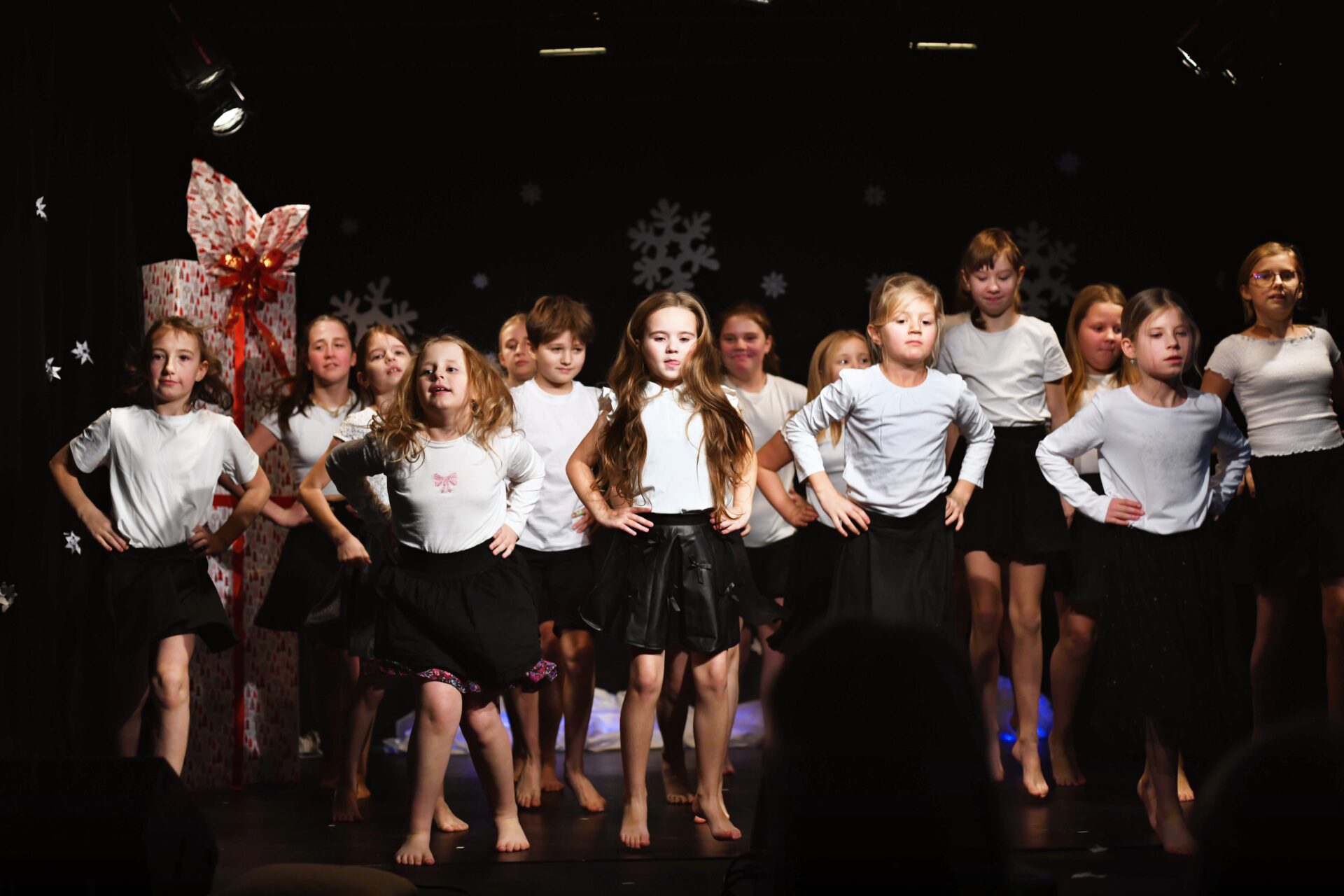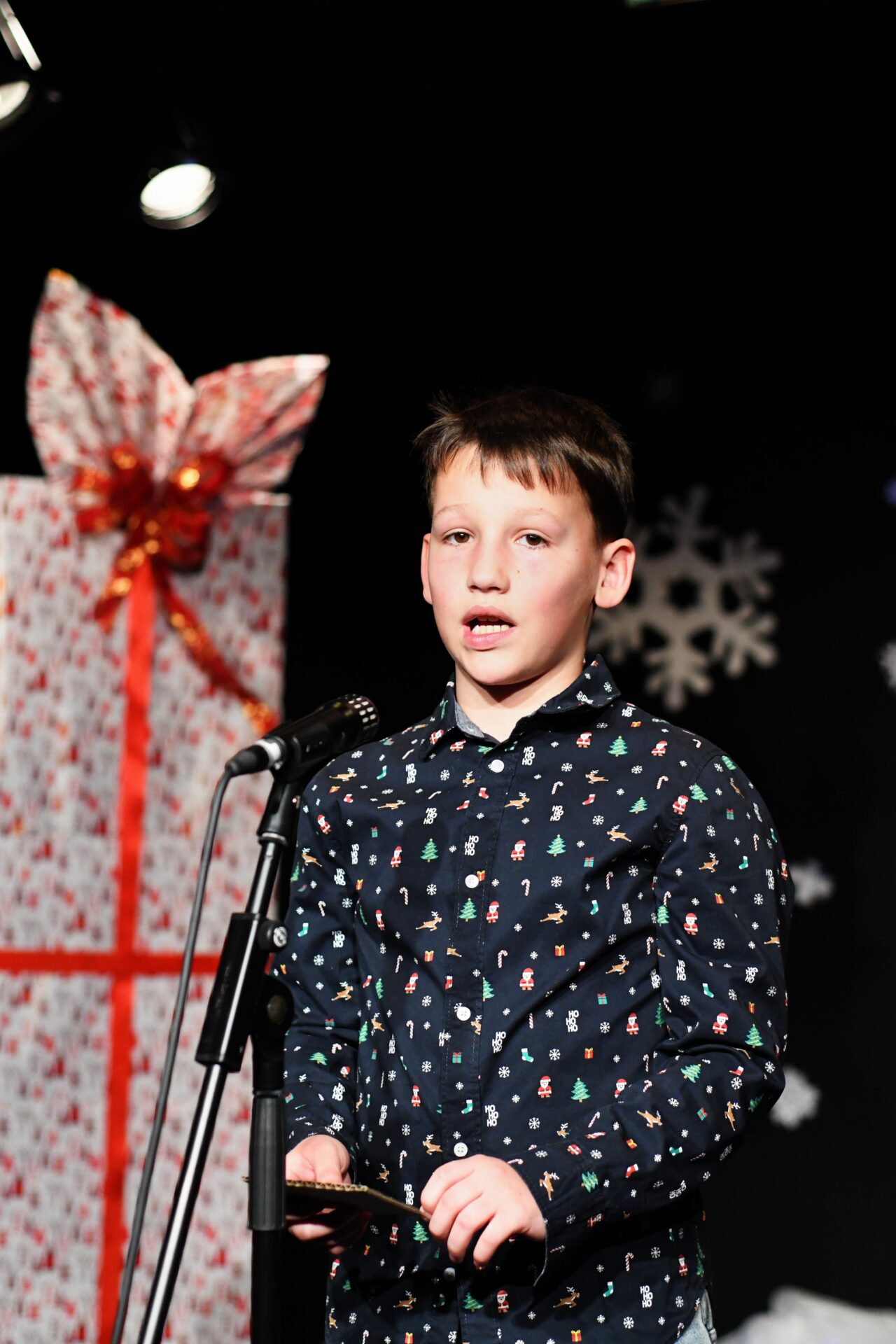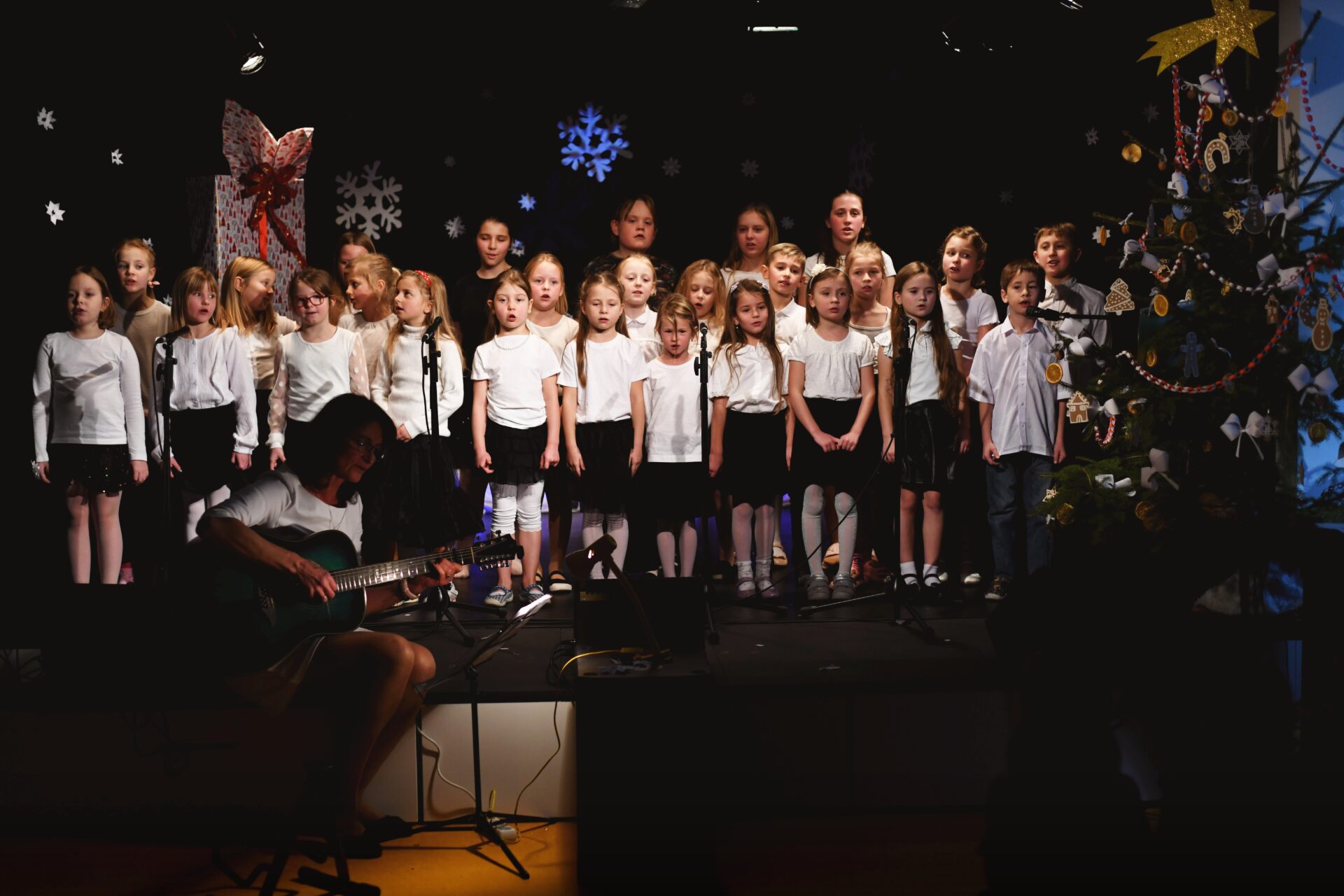 Celé vystoupení symbolicky začalo u štědrovečerního stolu, kde zasedla rodina, a netrpělivé děti s radostným očekáváním vyhlížely příchod Ježíška. Ale až zazvonění zvonečku oznámilo tu nejkrásnější chvíli – čas rozbalování dárků. V každém z nich se ukrývalo něco výjimečného – kouzelná vystoupení, která pod vedením paních učitelek natrénovaly děti z 1. stupně, děvčata z 8. A a žáci 9. A.