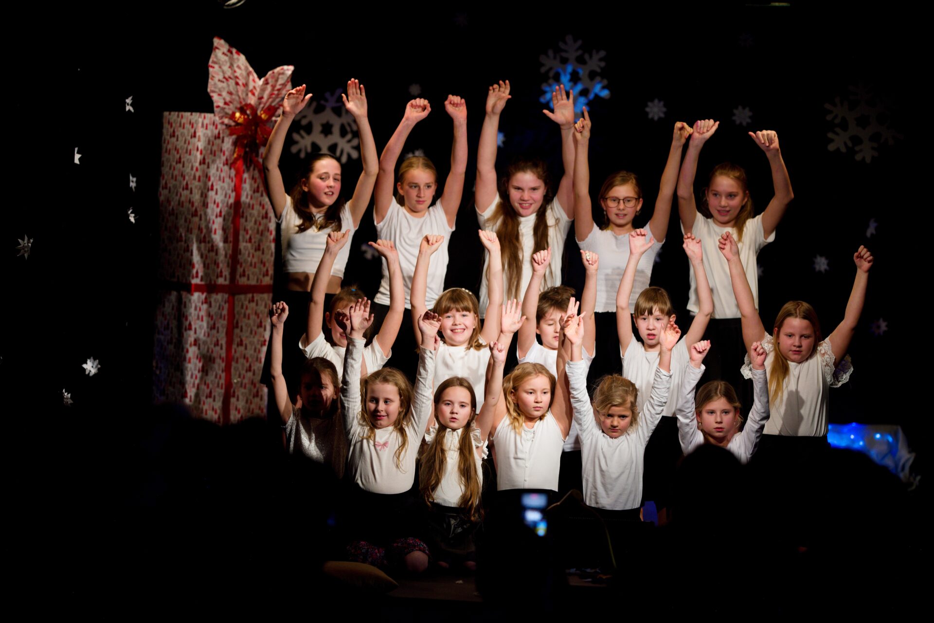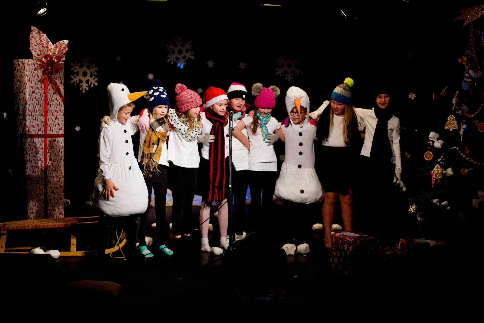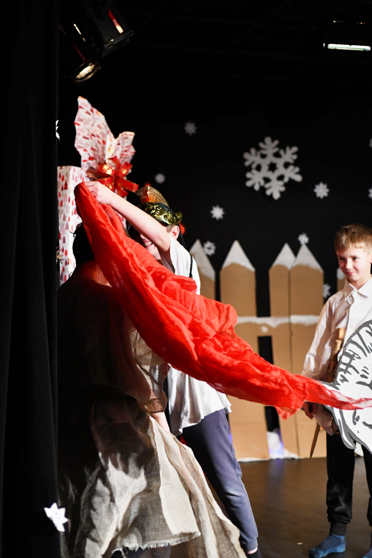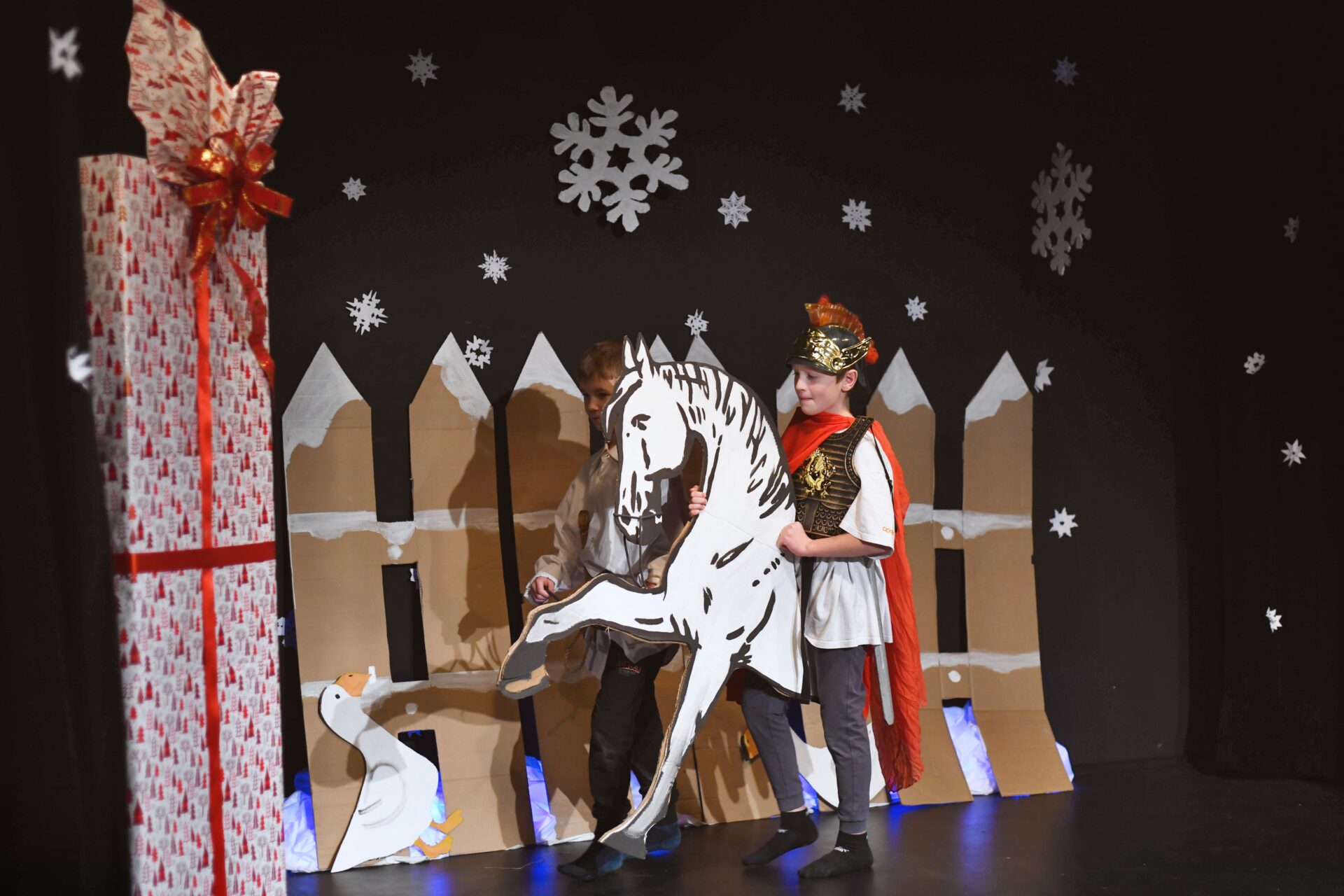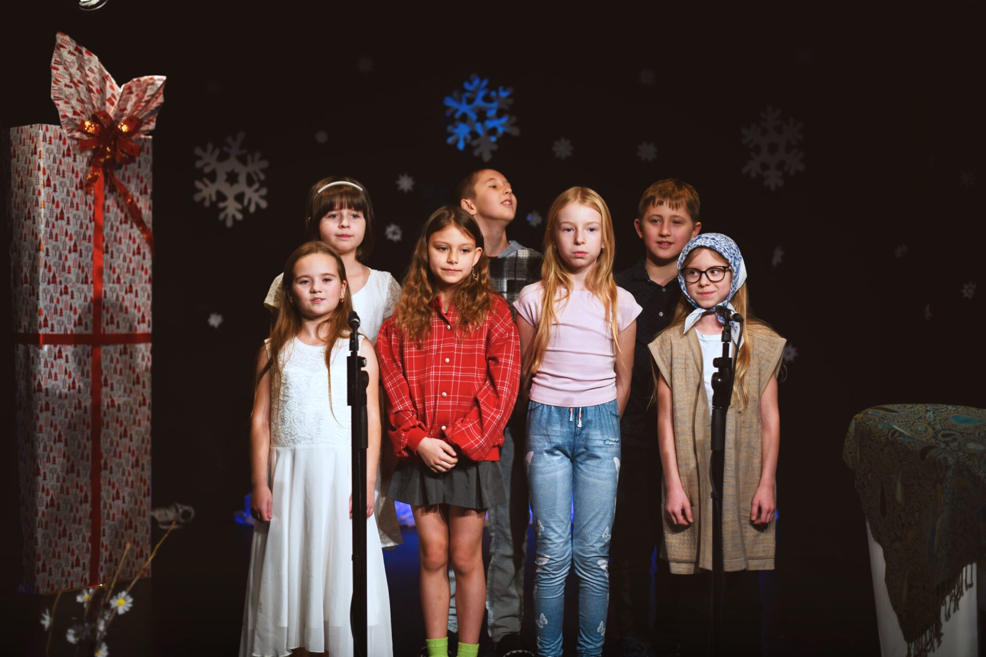 Celé vystoupení symbolicky začalo u štědrovečerního stolu, kde zasedla rodina, a netrpělivé děti s radostným očekáváním vyhlížely příchod Ježíška. Ale až zazvonění zvonečku oznámilo tu nejkrásnější chvíli – čas rozbalování dárků. V každém z nich se ukrývalo něco výjimečného – kouzelná vystoupení, která pod vedením paních učitelek natrénovaly děti z 1. stupně, děvčata z 8. A a žáci 9. A.