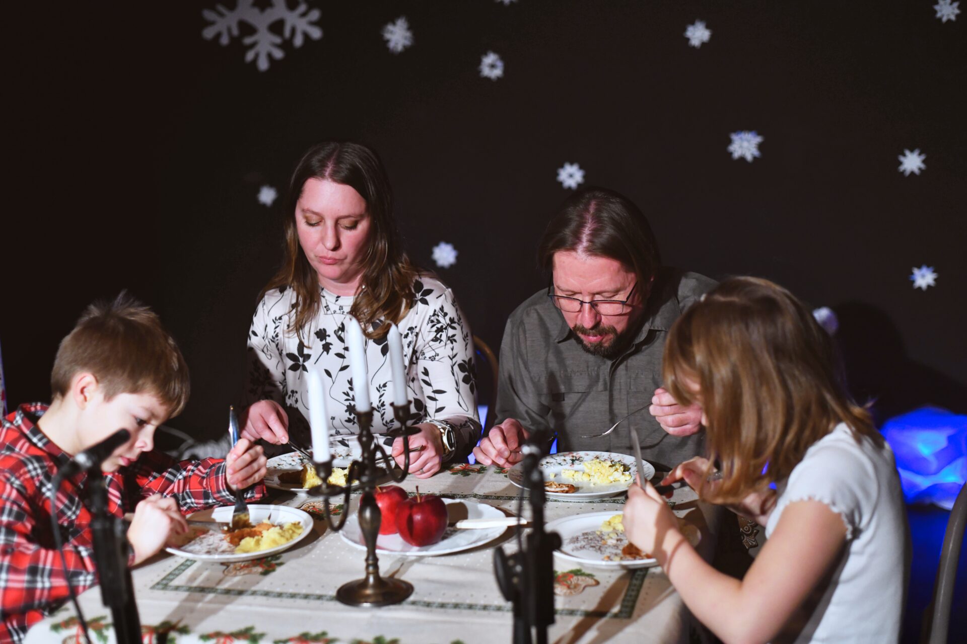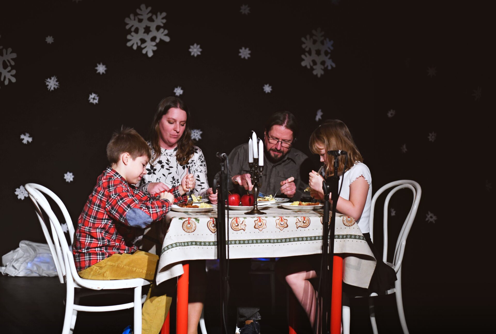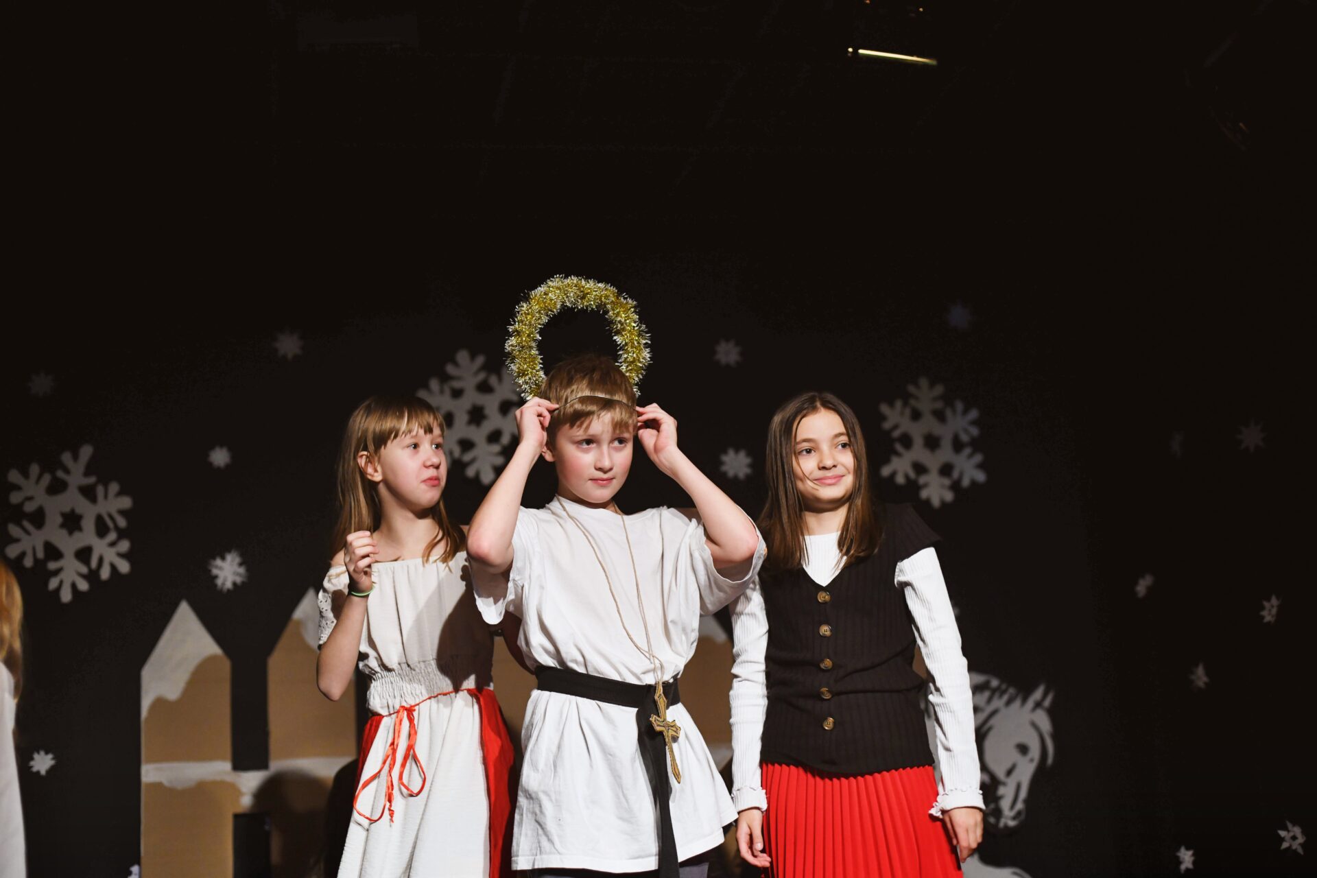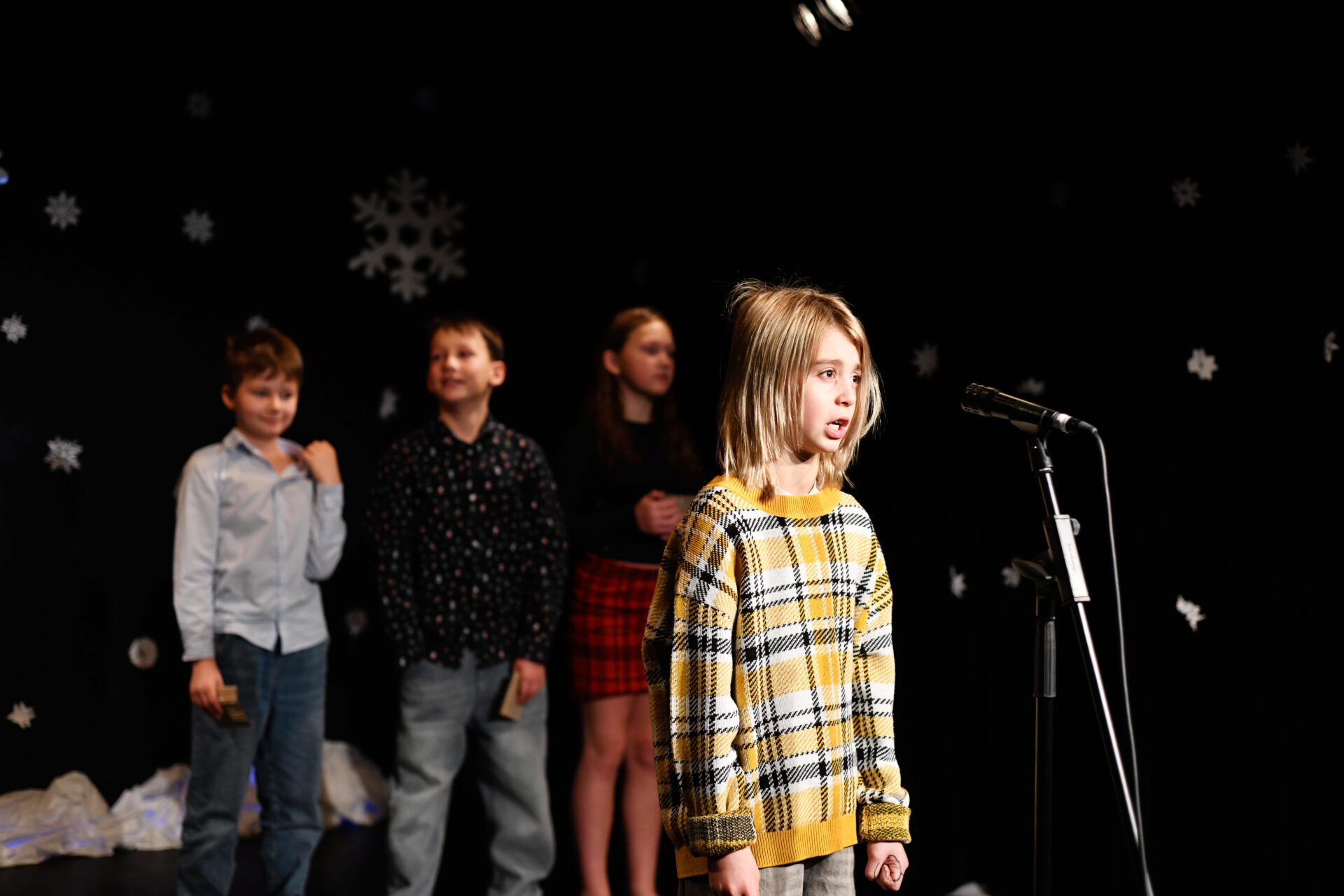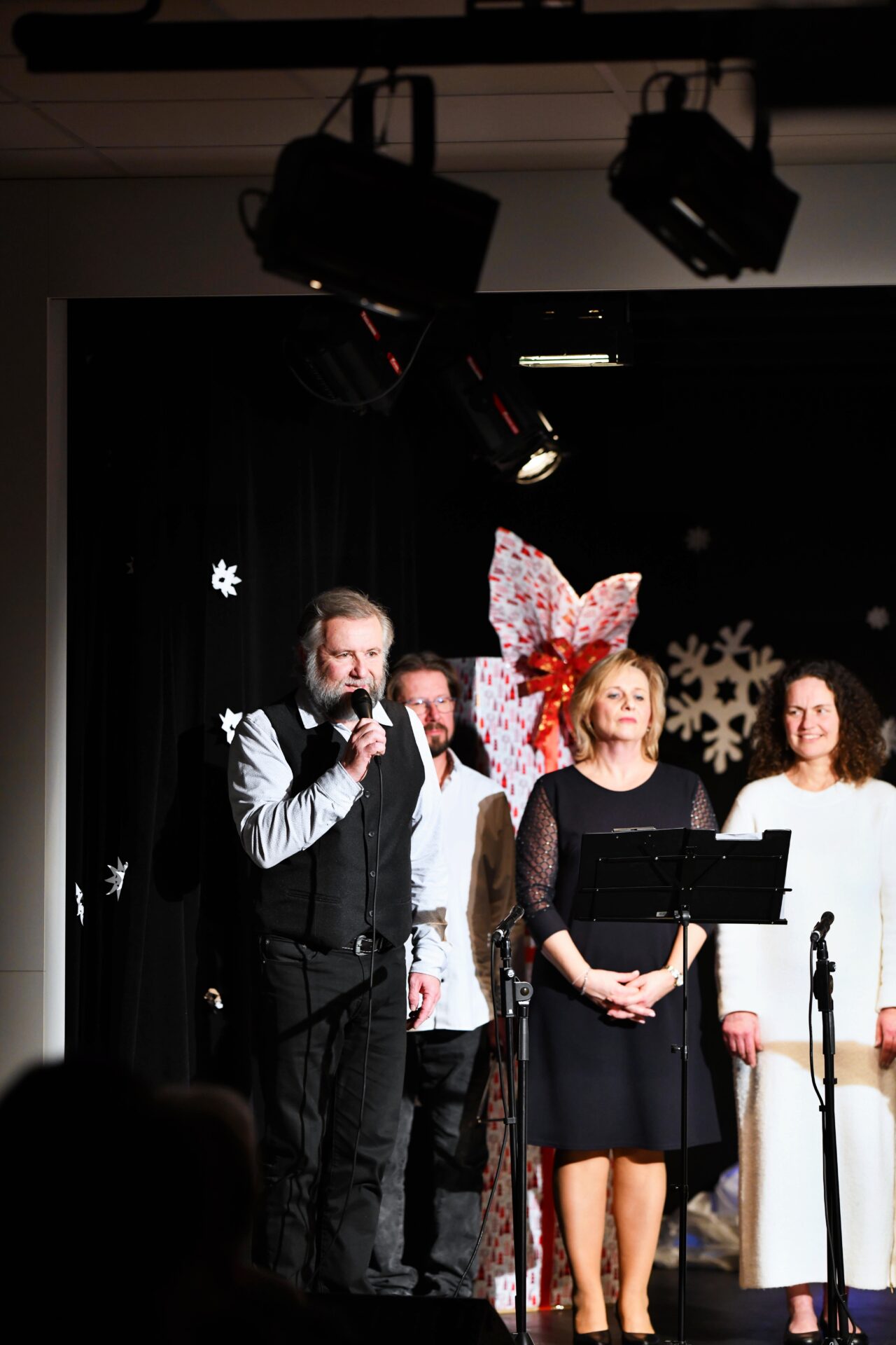Celé vystoupení symbolicky začalo u štědrovečerního stolu, kde zasedla rodina, a netrpělivé děti s radostným očekáváním vyhlížely příchod Ježíška. Ale až zazvonění zvonečku oznámilo tu nejkrásnější chvíli – čas rozbalování dárků. V každém z nich se ukrývalo něco výjimečného – kouzelná vystoupení, která pod vedením paních učitelek natrénovaly děti z 1. stupně, děvčata z 8. A a žáci 9. A.